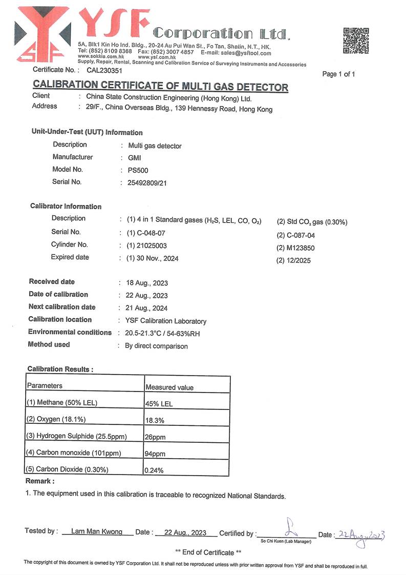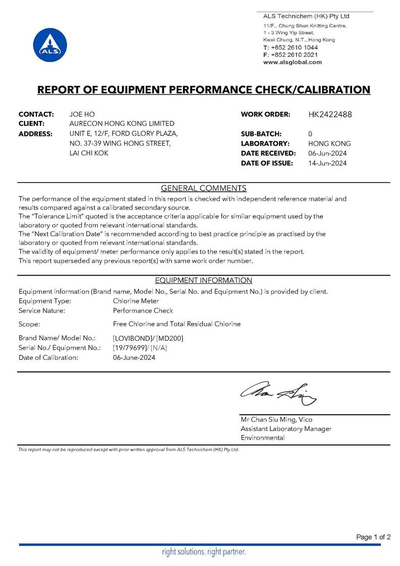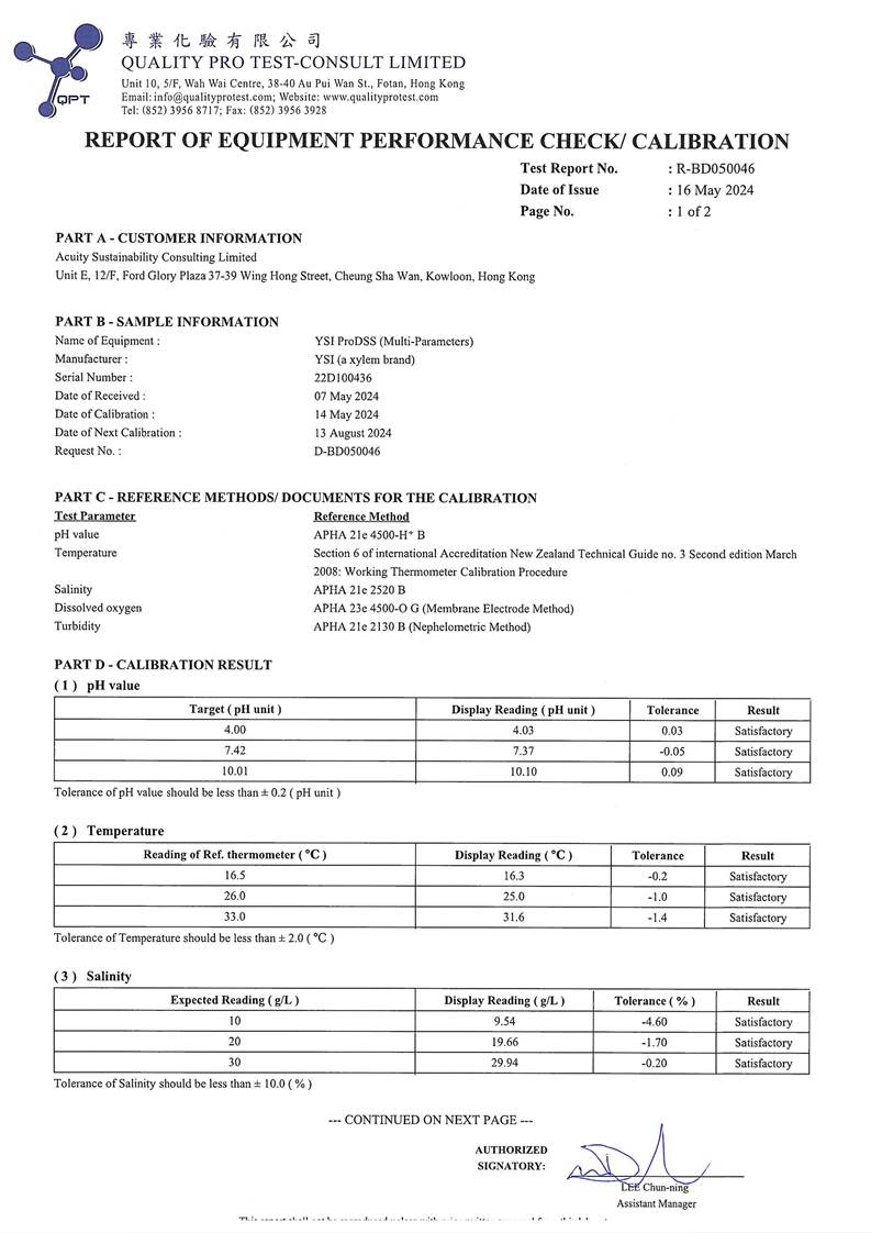 Water Quality Monitoring Equipment and Landfill Gas Equipment Calibration Certificate |