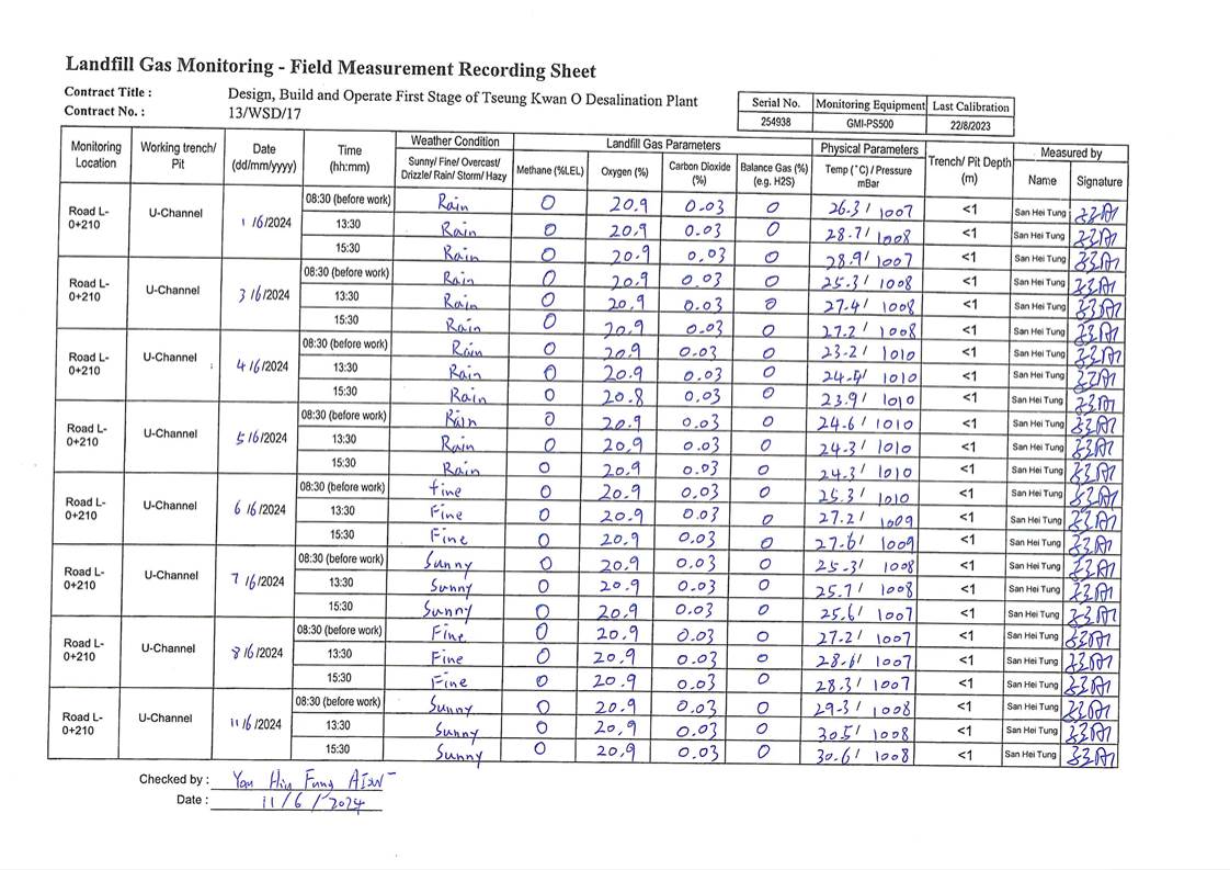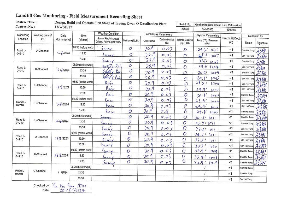 A14. In this reporting period, 45 times of landfill gas monitoring were periodically conducted at TKO Area 137 (Ch1+120 - Ch1+800) until 20 April 2024. No exceedances of action level and limit level was observed.
