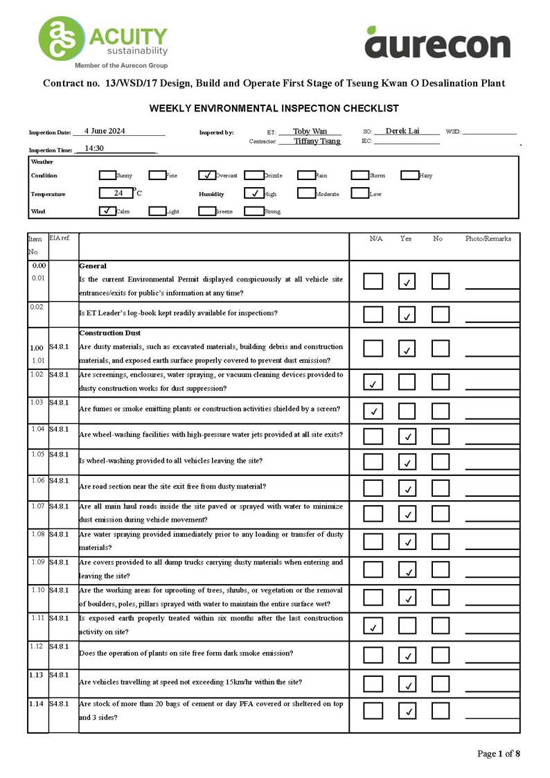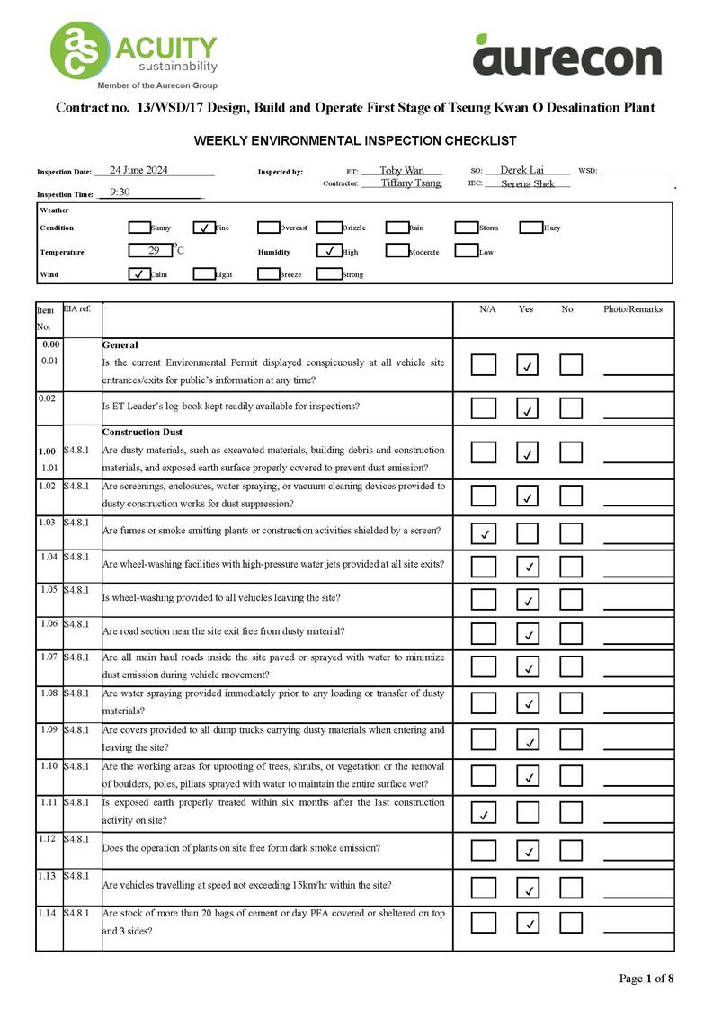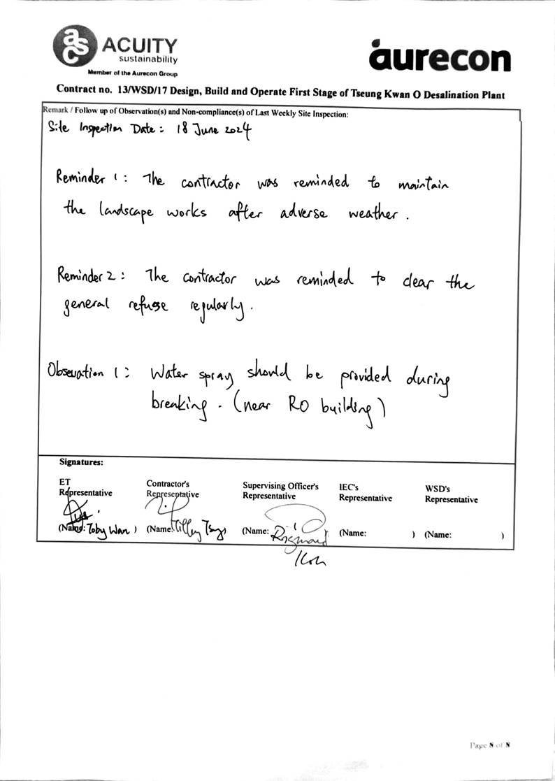 A15. Joint site inspections of the construction work by ET and IEC were carried out on 24 June 2024 to audit the mitigation measures implementation status. Reminders were recorded in the site inspection checklists and provided to the contractors together with the appropriate follow-up actions where necessary.
