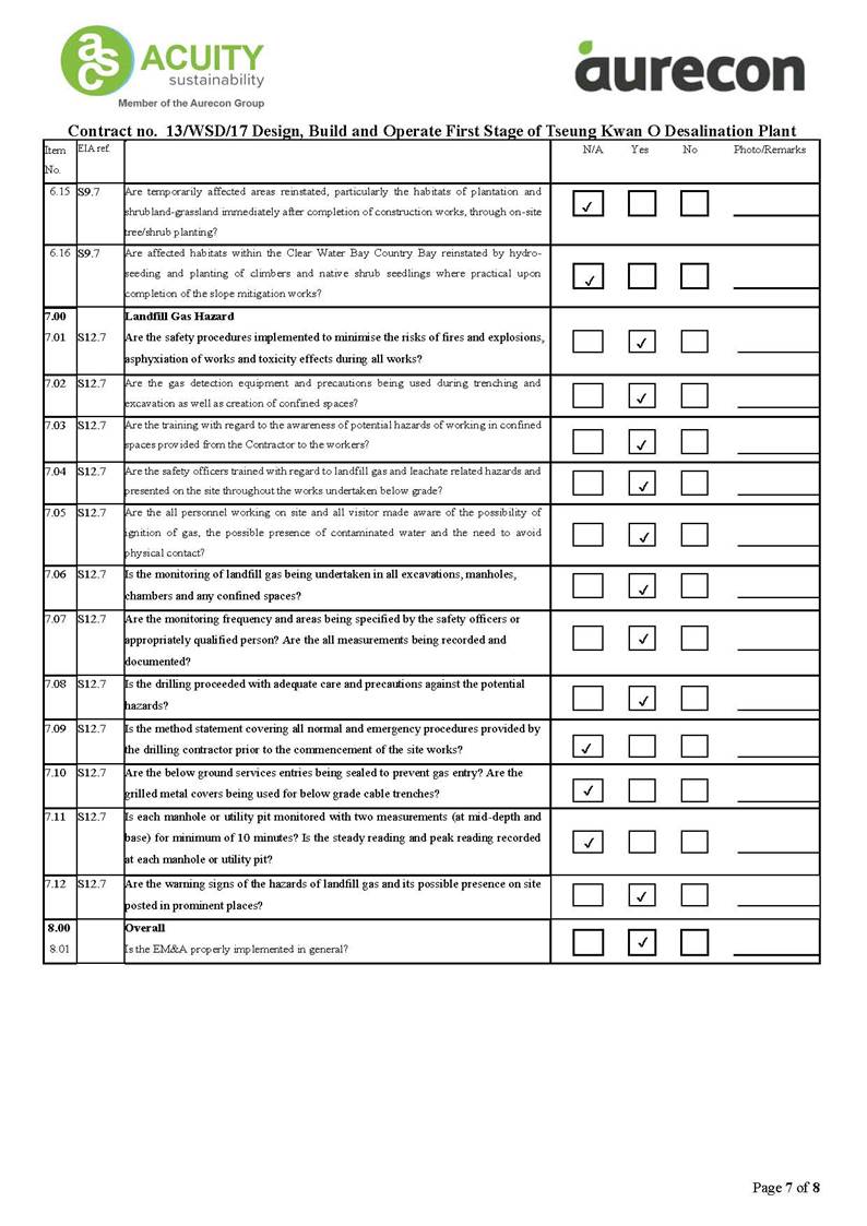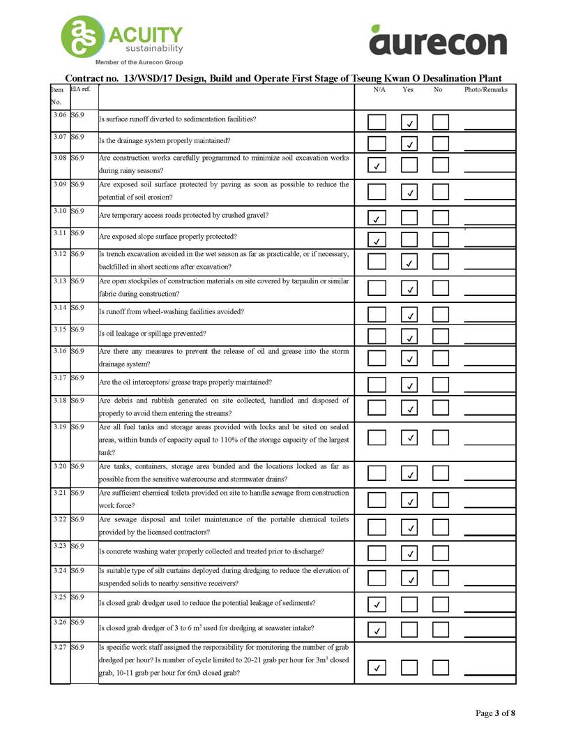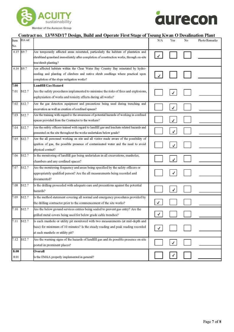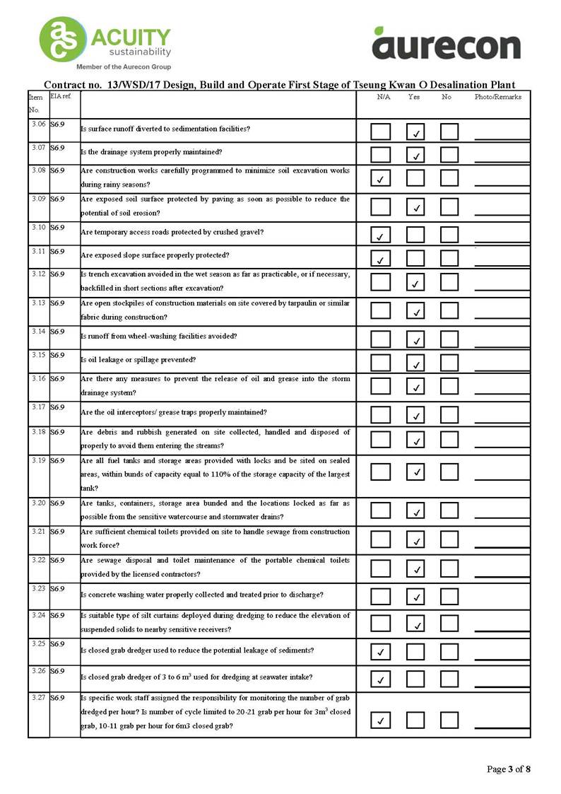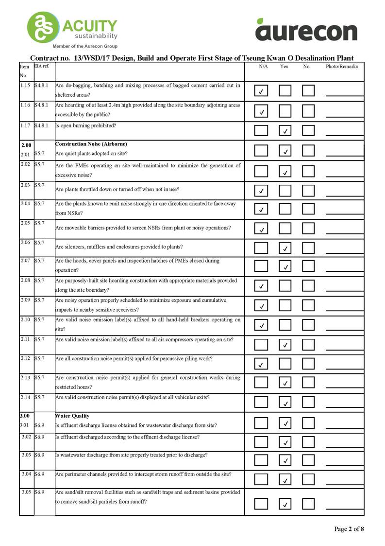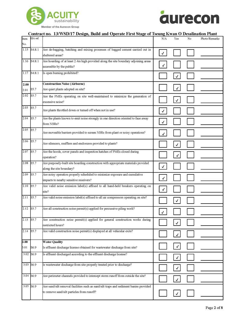 A2. In accordance with the Environmental Monitoring and Audit (EM&A) Manual for the Contract, EM&A works for marine water quality, noise, waste management and ecology should be carried out by Environmental Team (ET), Acuity Sustainability Consulting Limited (ASCL), during the construction phase of the Contract.