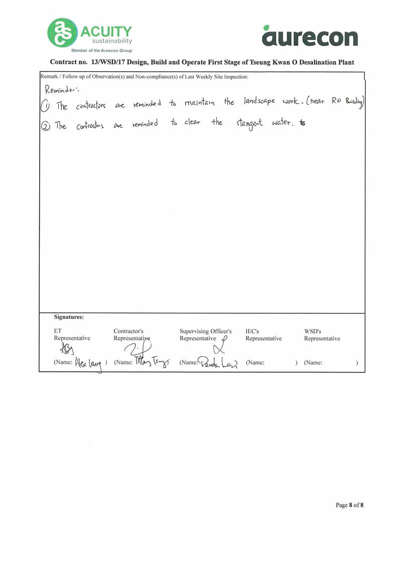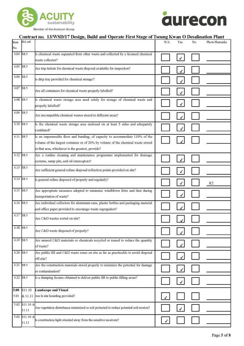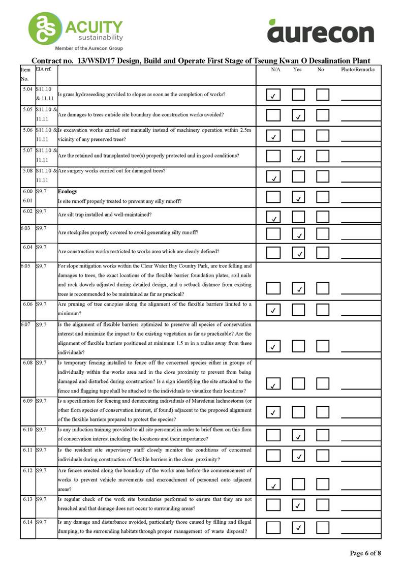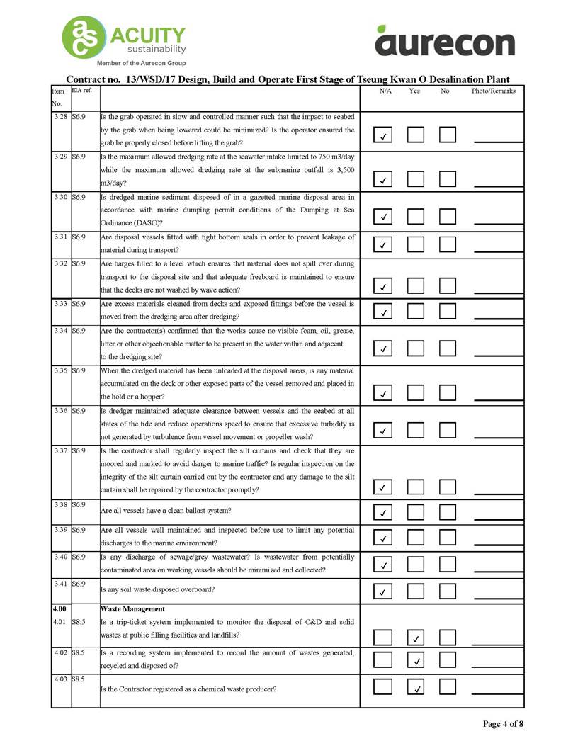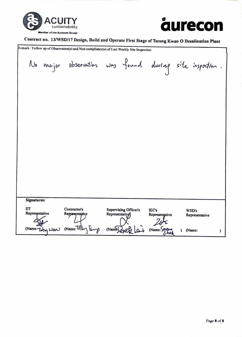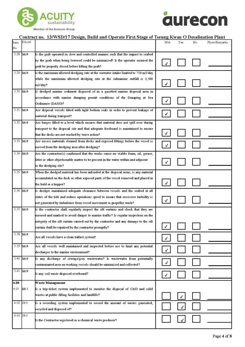 A2. In accordance with the Environmental Monitoring and Audit (EM&A) Manual for the Contract, EM&A works for marine water quality, noise, waste management and ecology should be carried out by Environmental Team (ET), Acuity Sustainability Consulting Limited (ASCL), during the construction phase of the Contract.