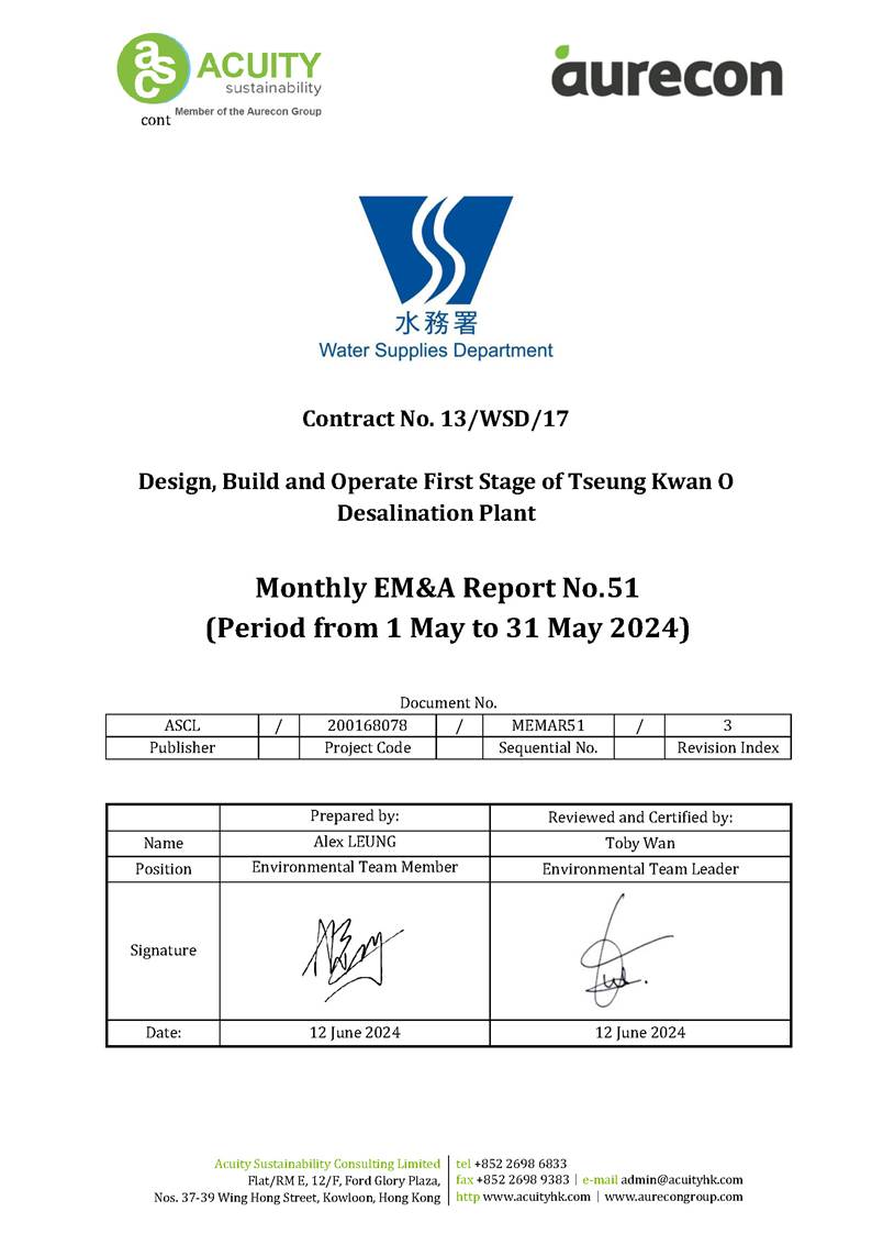 A3. This is the 51st Monthly EM&A Report, prepared by ASCL, for the Contract summarizing the monitoring results and audit findings of the EM&A programme at and around Tseung Kwan O Area 137 (TKO 137) during the reporting period from 1 May to 31 May 2024.