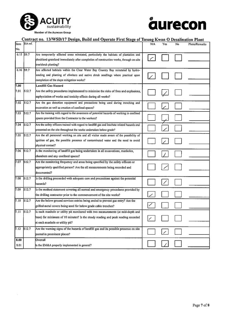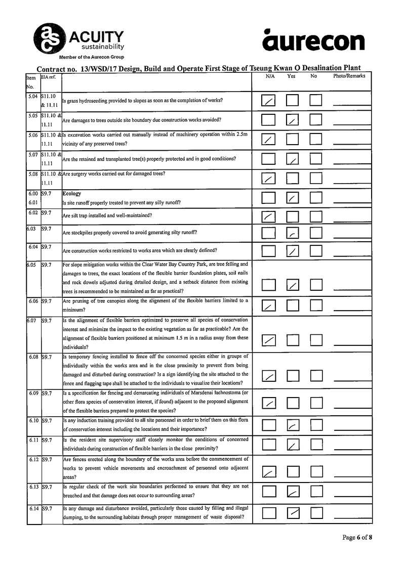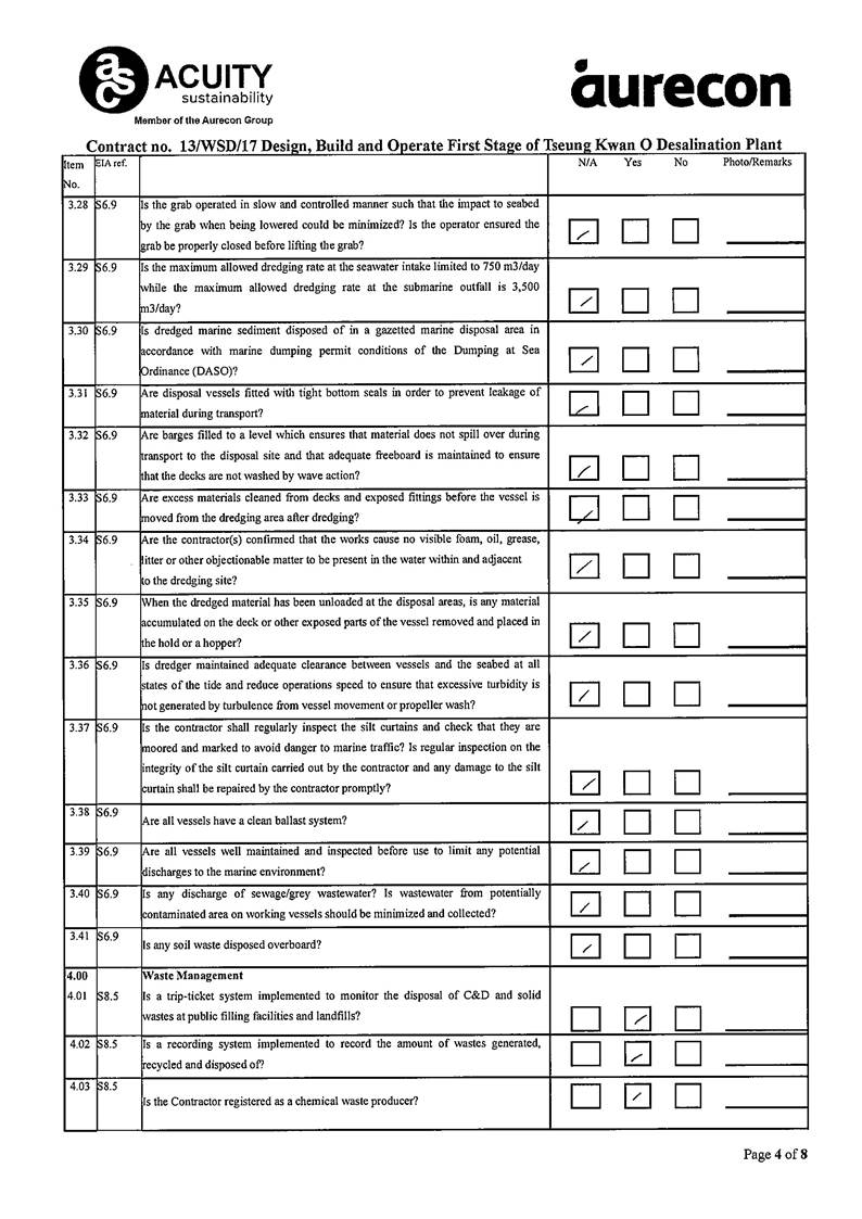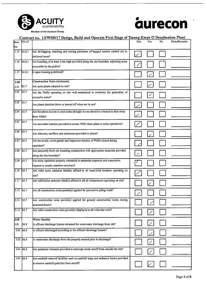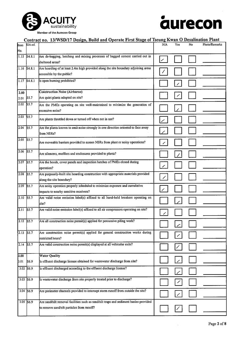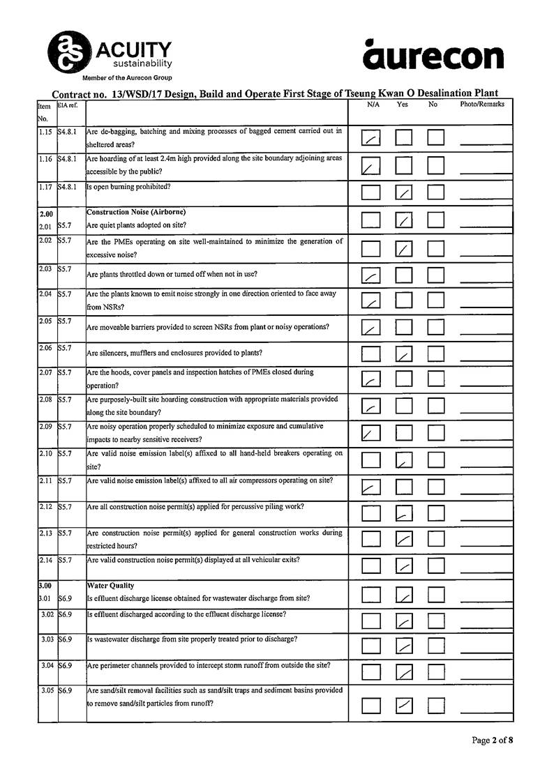 A2. In accordance with the Environmental Monitoring and Audit (EM&A) Manual for the Contract, EM&A works for marine water quality, noise, waste management and ecology should be carried out by Environmental Team (ET), Acuity Sustainability Consulting Limited (ASCL), during the construction phase of the Contract.