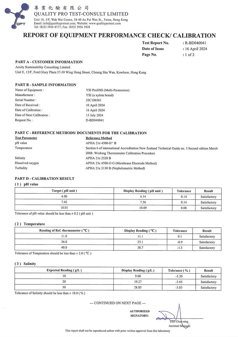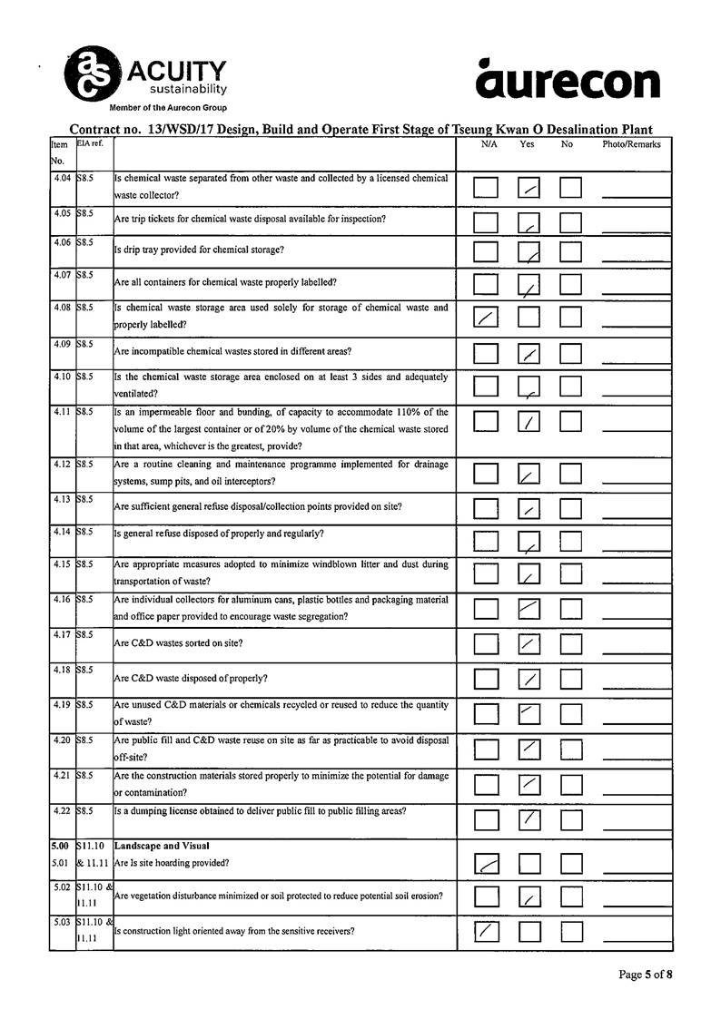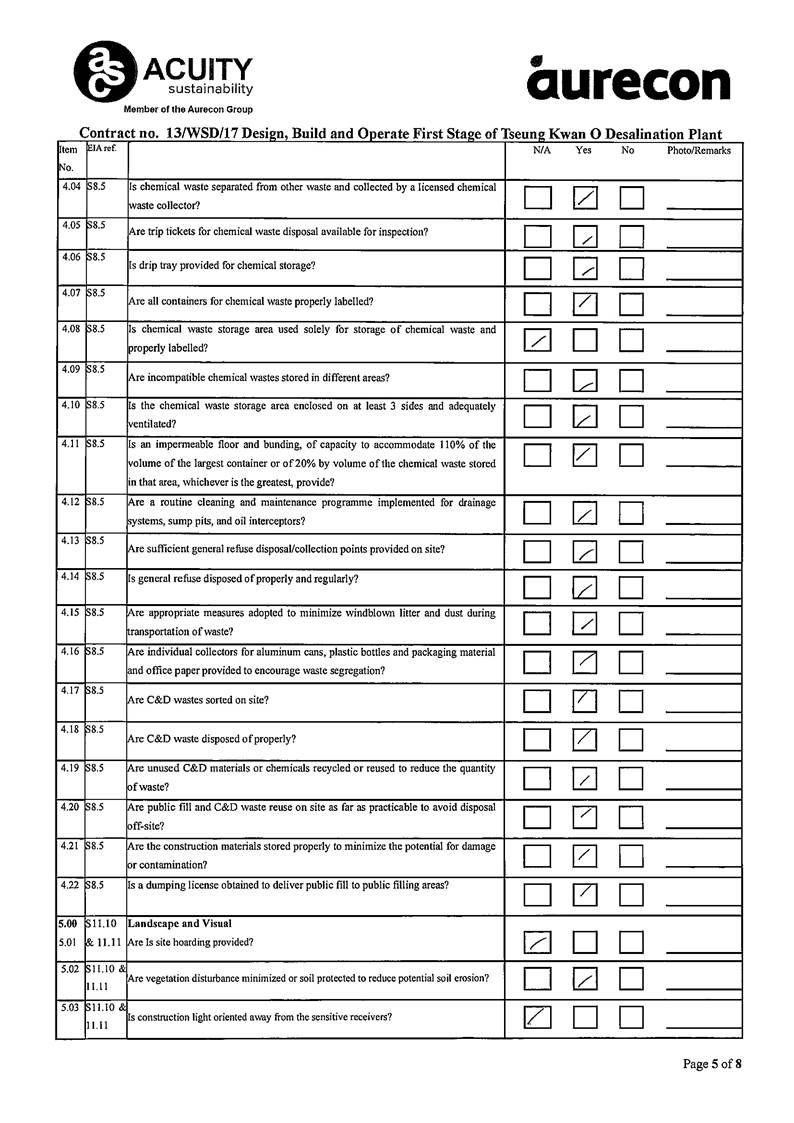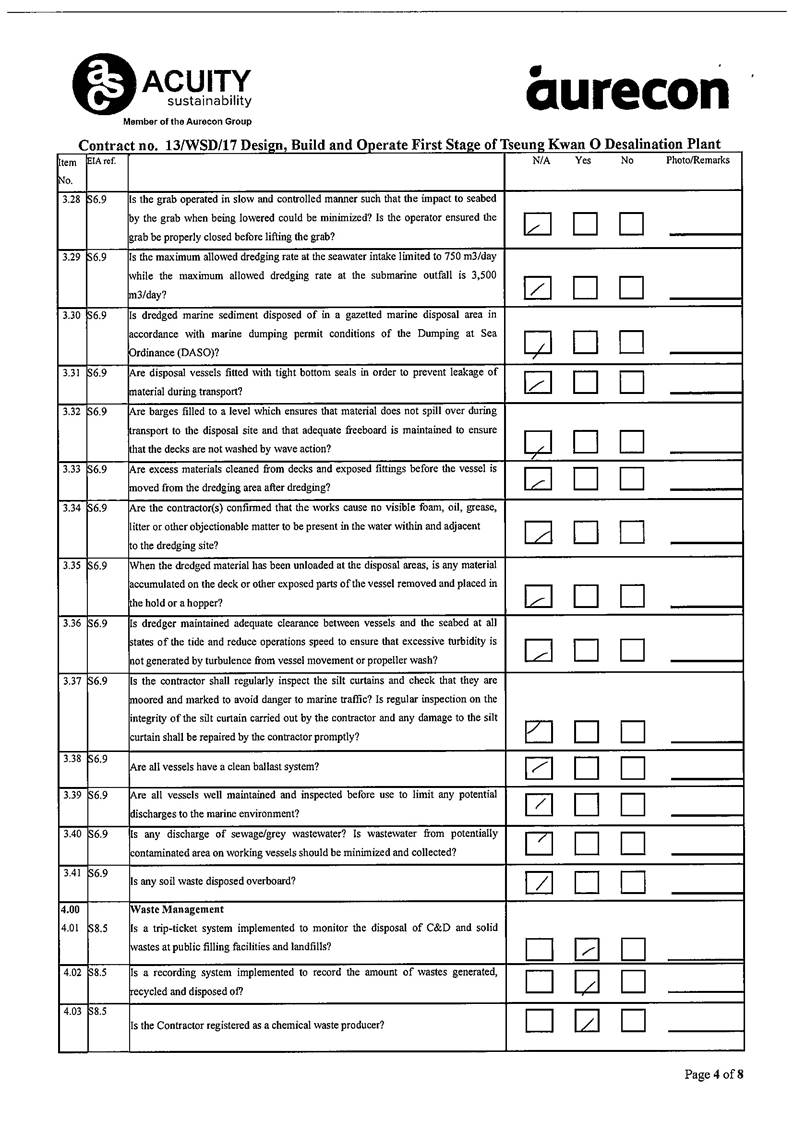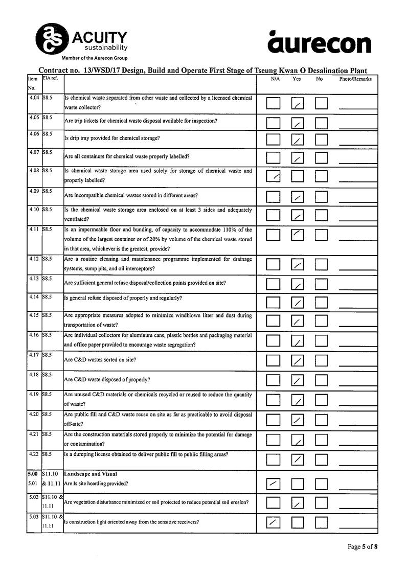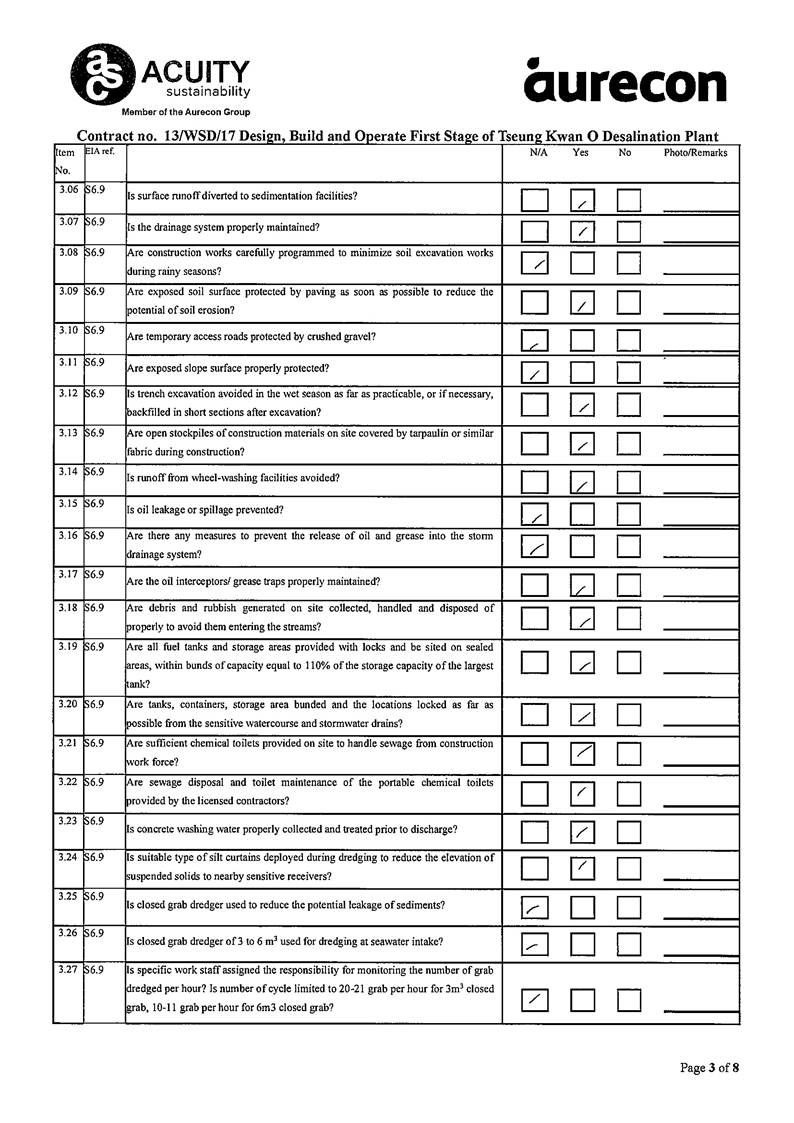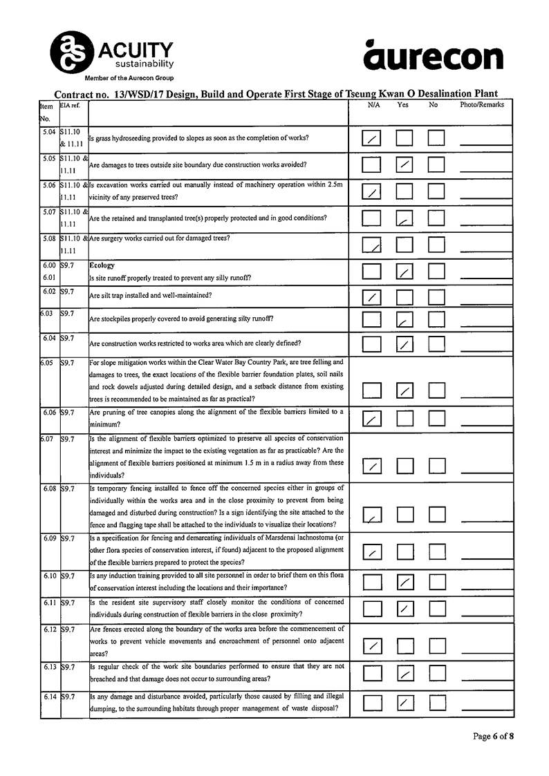 A2. In accordance with the Environmental Monitoring and Audit (EM&A) Manual for the Contract, EM&A works for marine water quality, noise, waste management and ecology should be carried out by Environmental Team (ET), Acuity Sustainability Consulting Limited (ASCL), during the construction phase of the Contract.