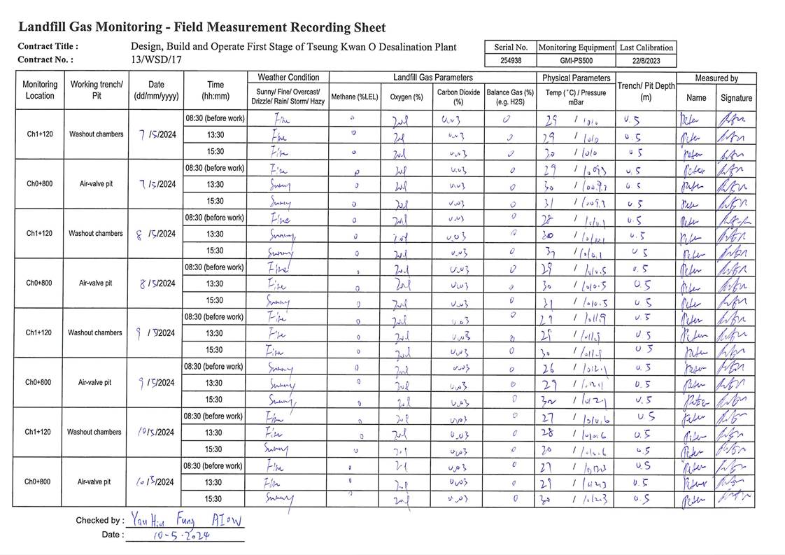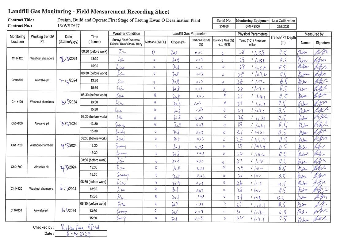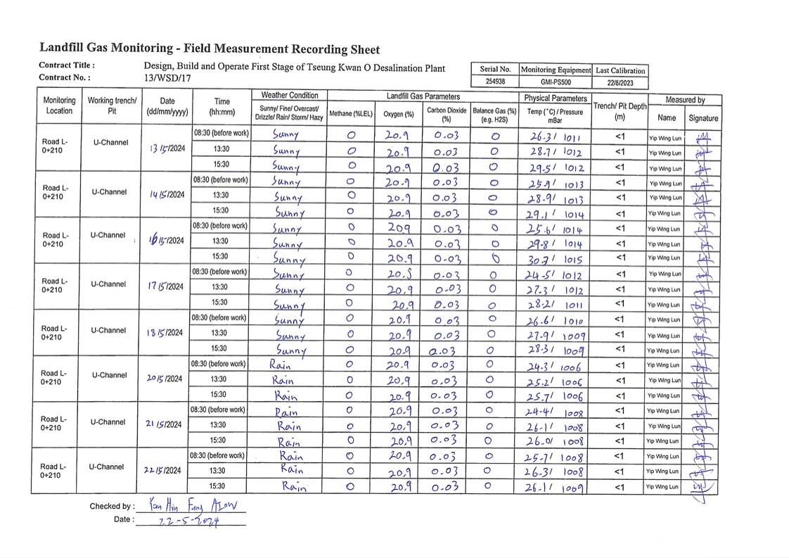 A14. In this reporting period, 96 times of landfill gas monitoring were periodically conducted at TKO Area 137 (Ch1+120 - Ch1+800). No exceedances of action level and limit level was observed.