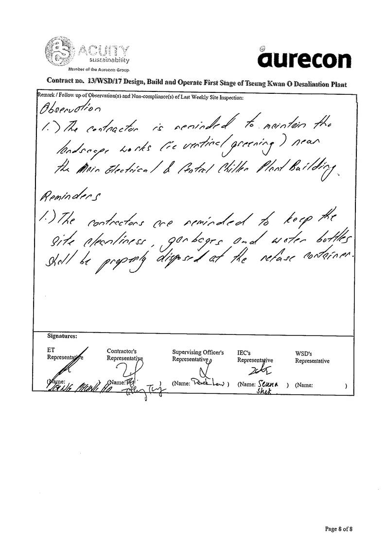 A1. The Project, Design, Build and Operate First Stage of Tseung Kwan O Desalination Plant (TKODP), is a Designated Project under the Environmental Impact Assessment Ordinance (Cap. 499) (EIAO) and is currently governed by a Further Environmental Permit (EP No. FEP - 01/503/2015/B) for the construction and operation of the Contract.