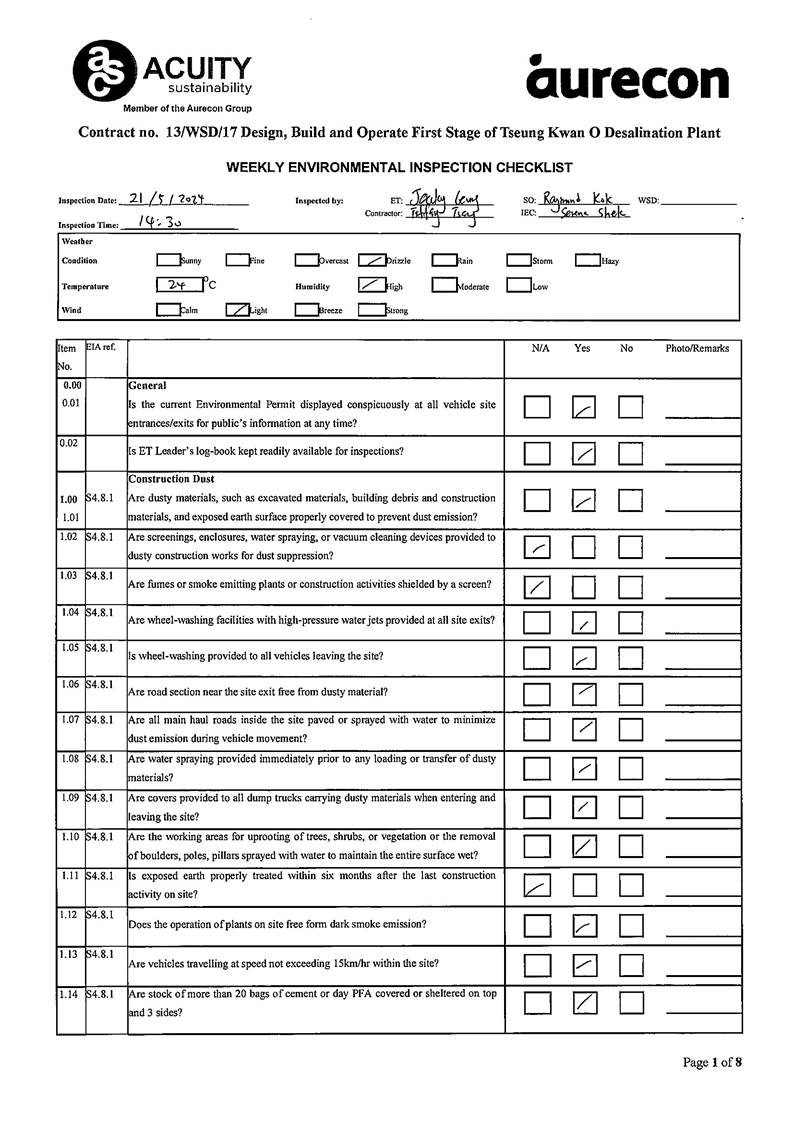 A15. Joint site inspections of the construction work by ET and IEC were carried out on 28 May 2024 to audit the mitigation measures implementation status. Reminders were recorded in the site inspection checklists and provided to the contractors together with the appropriate follow-up actions where necessary.