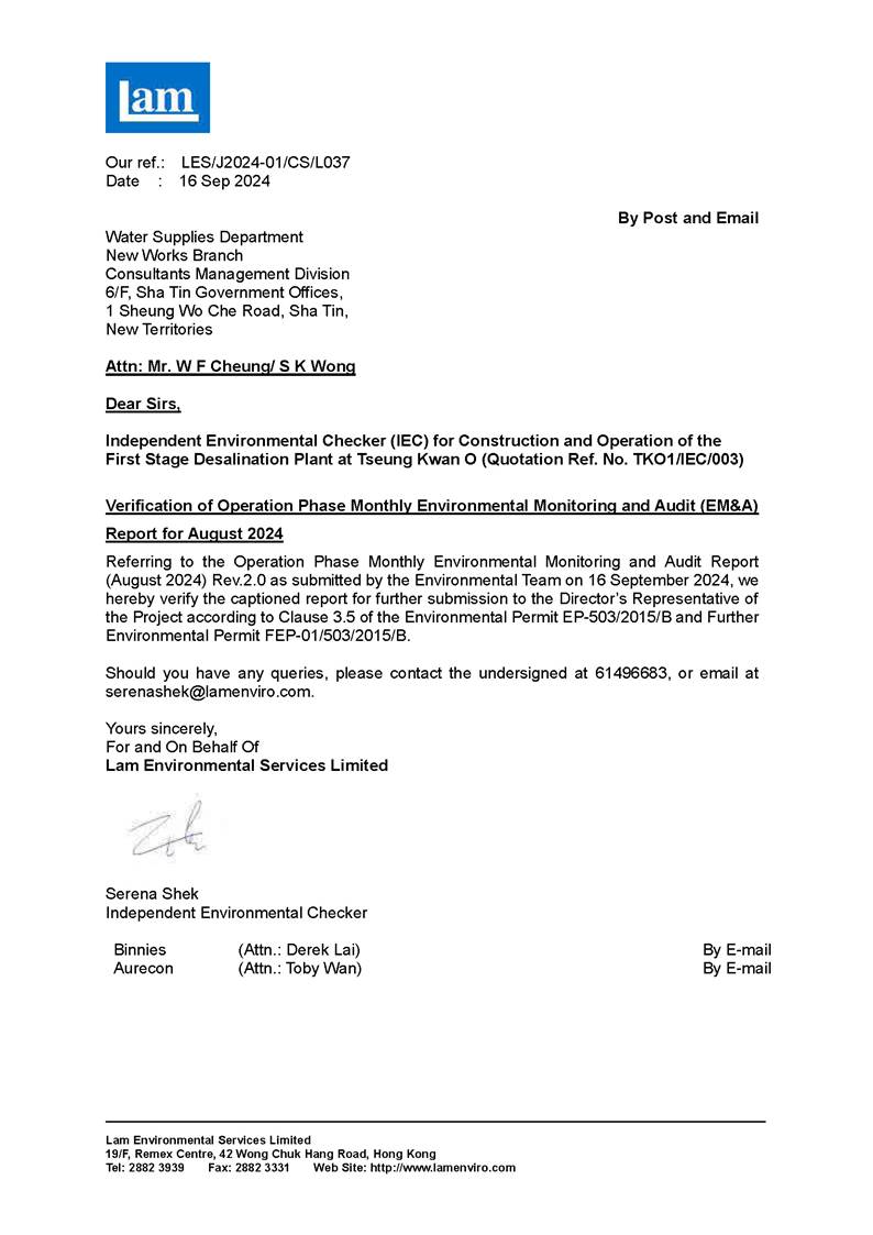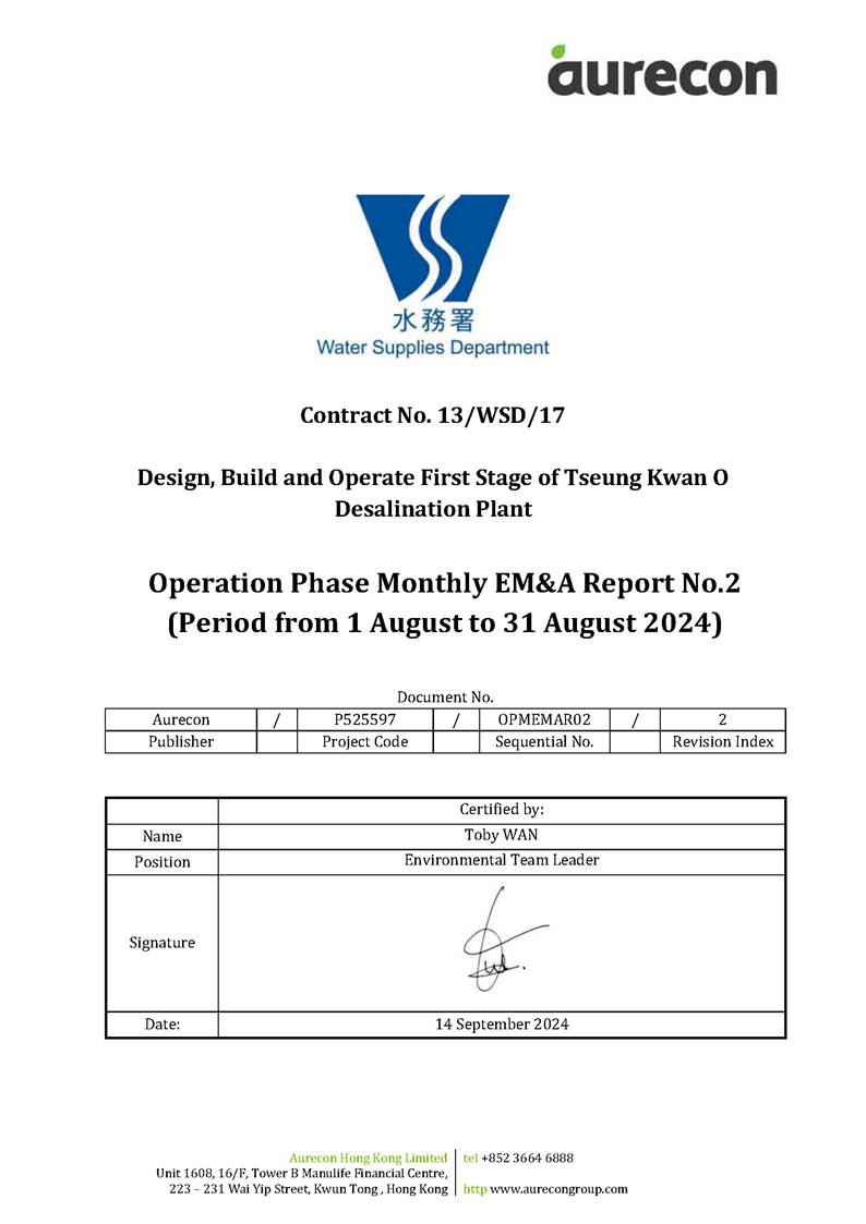 A3. The TKODP commenced the operation stage on 1 July 2024. This is the 2nd Operation Phase Monthly EM&A Report, prepared by Aurecon, for the Contract summarizing the monitoring results and audit findings of the EM&A programme at and around Tseung Kwan O Area 137 (TKO 137) during first-year operation of Tseung Kwan O Desalination Plant in August 2024.