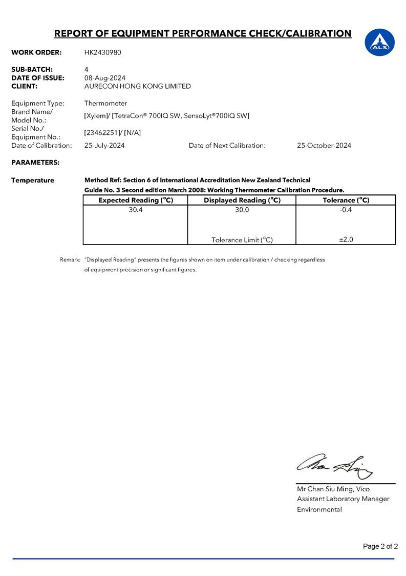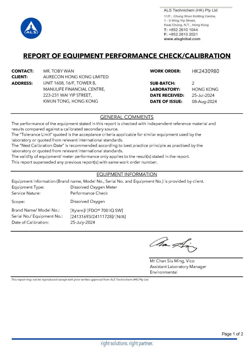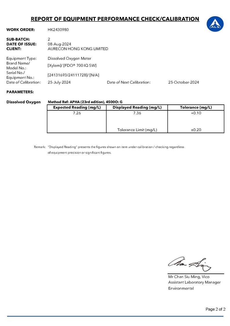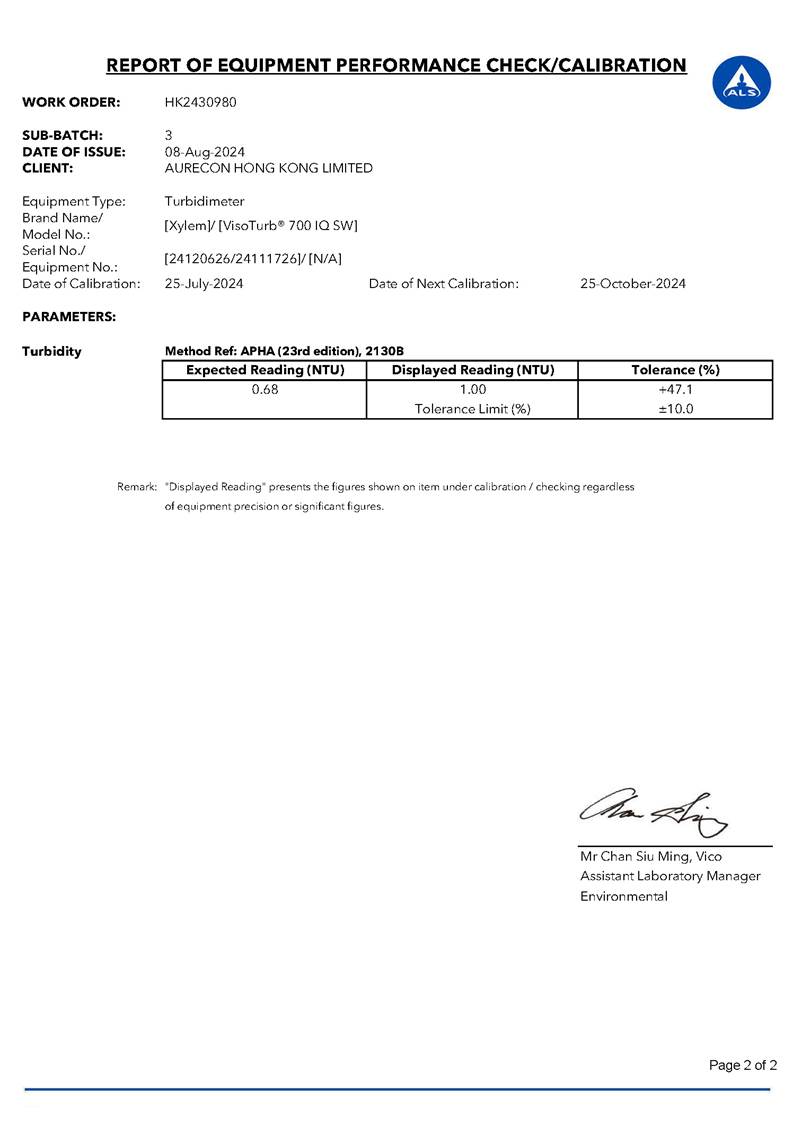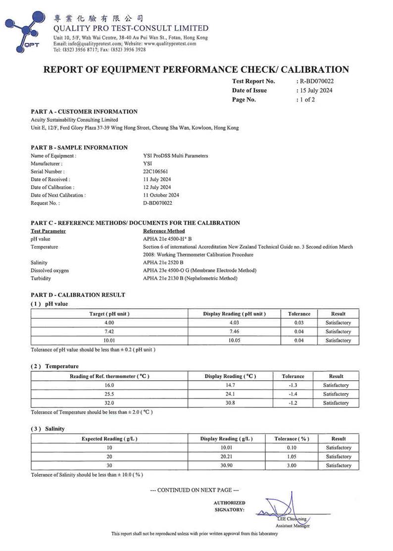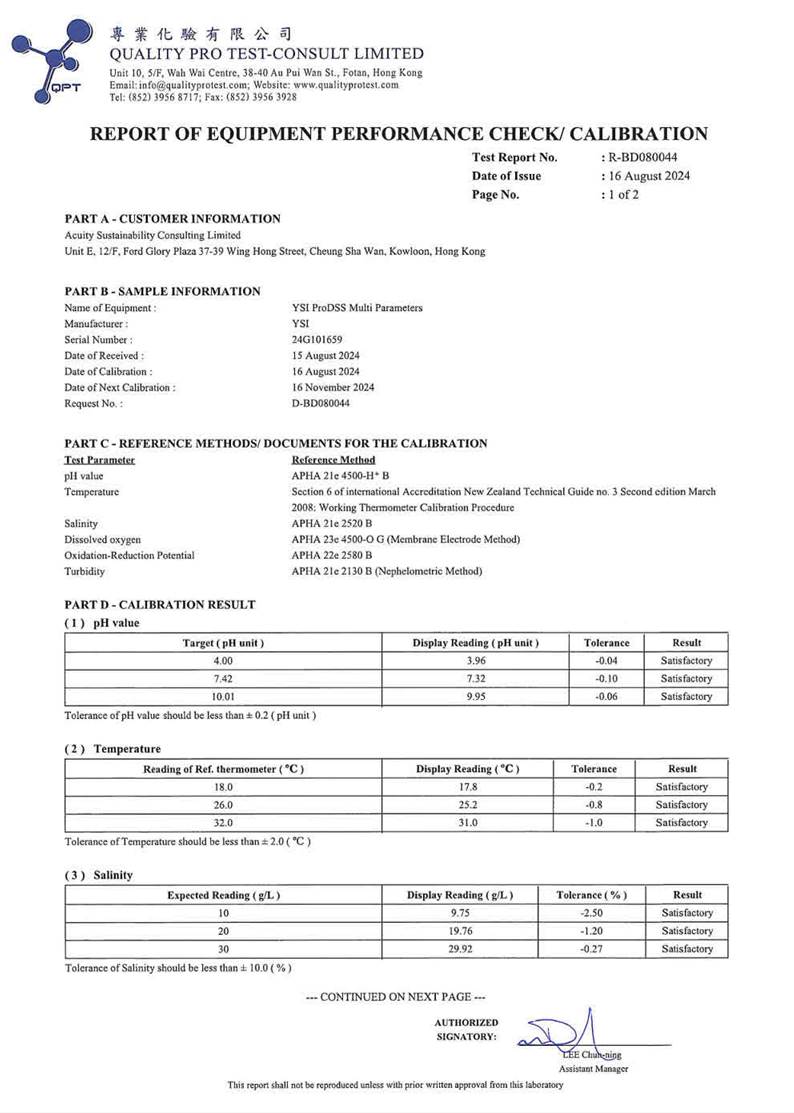 Water Quality Monitoring Equipment and Landfill Gas Equipment Calibration Certificate |