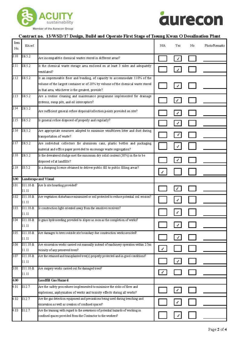A2. In accordance with the Environmental Monitoring and Audit (EM&A) Manual for the Contract, EM&A works for marine water quality, waste management and ecology should be carried out by Environmental Team (ET), Aurecon Hong Kong Limited (Aurecon), during the Tseung Kwan O Desalination Plant.