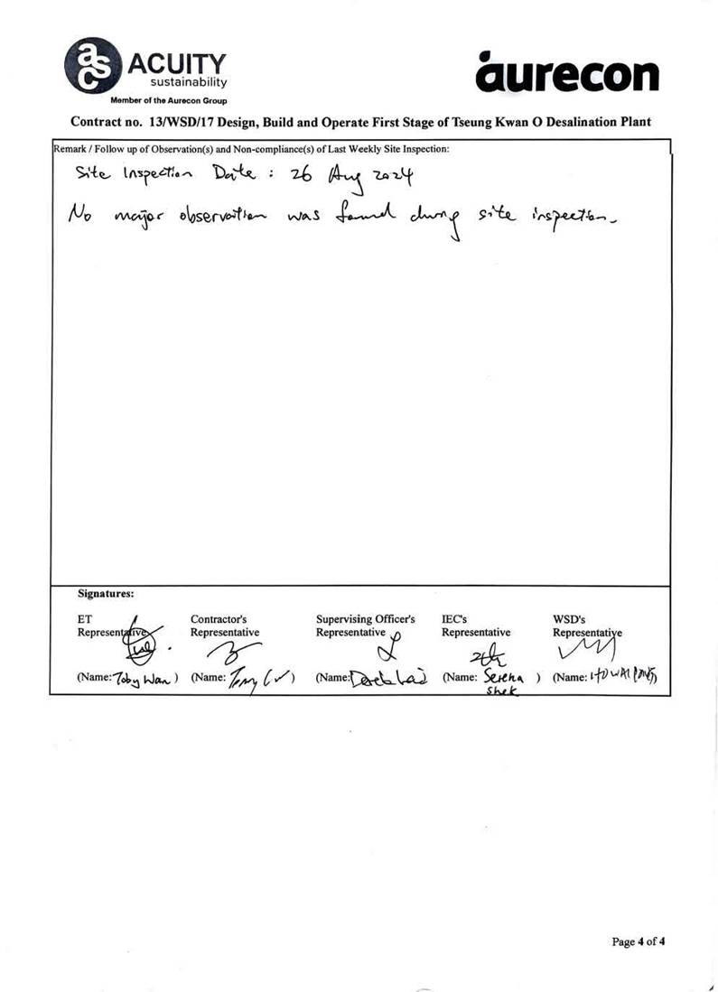 A10. In this reporting period, site inspections were carried out by ET on 6, 13, 20 and 26 August 2024. Joint site inspections of the operation work by ET were and IEC were carried out on 26 August 2024 to audit the mitigation measures implementation status.
