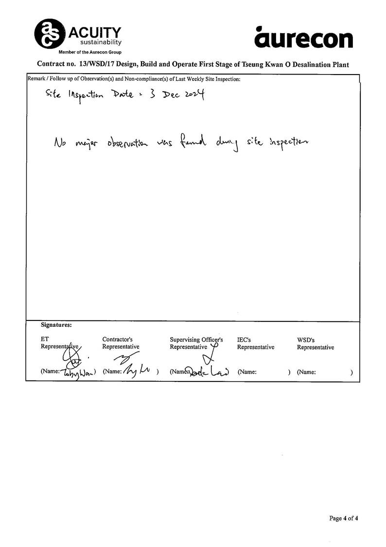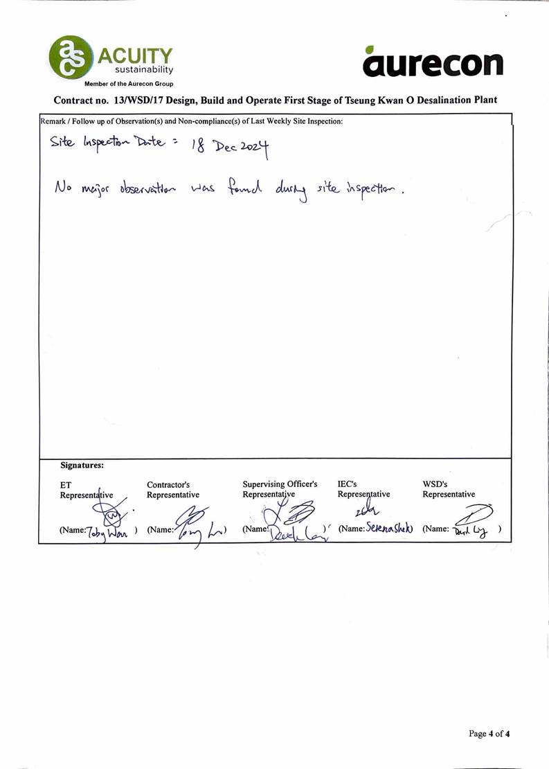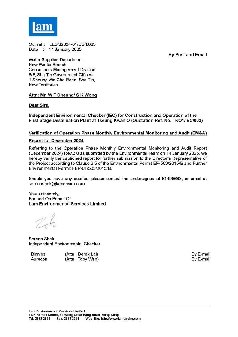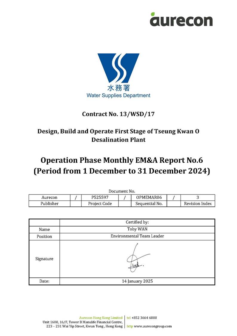 A3. The TKODP commenced the operation stage on 1 July 2024. This is the 6th Operation Phase Monthly EM&A Report, prepared by Aurecon, for the Contract summarizing the monitoring results and audit findings of the EM&A programme at and around Tseung Kwan O Area 137 (TKO 137) during first-year operation of Tseung Kwan O Desalination Plant in December 2024.