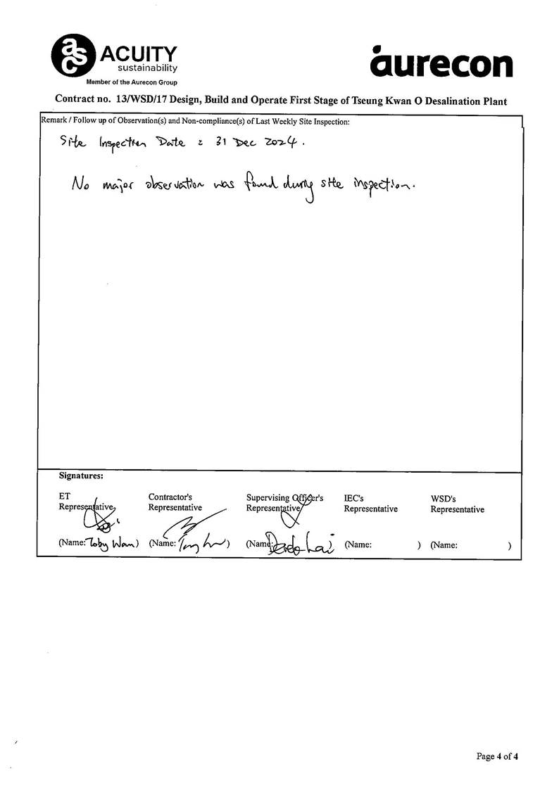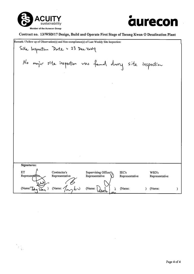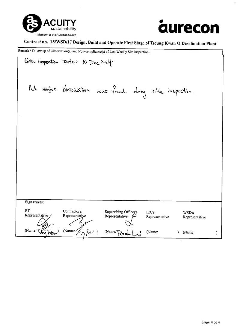 A3. The TKODP commenced the operation stage on 1 July 2024. This is the 6th Operation Phase Monthly EM&A Report, prepared by Aurecon, for the Contract summarizing the monitoring results and audit findings of the EM&A programme at and around Tseung Kwan O Area 137 (TKO 137) during first-year operation of Tseung Kwan O Desalination Plant in December 2024.