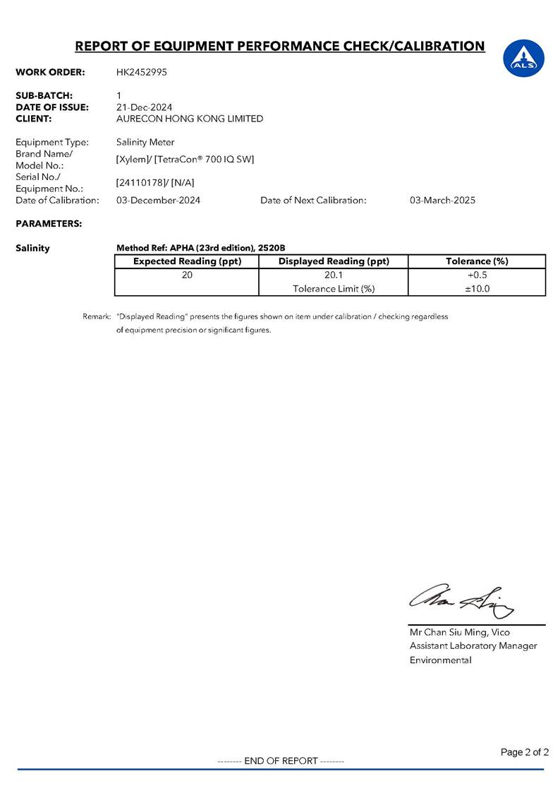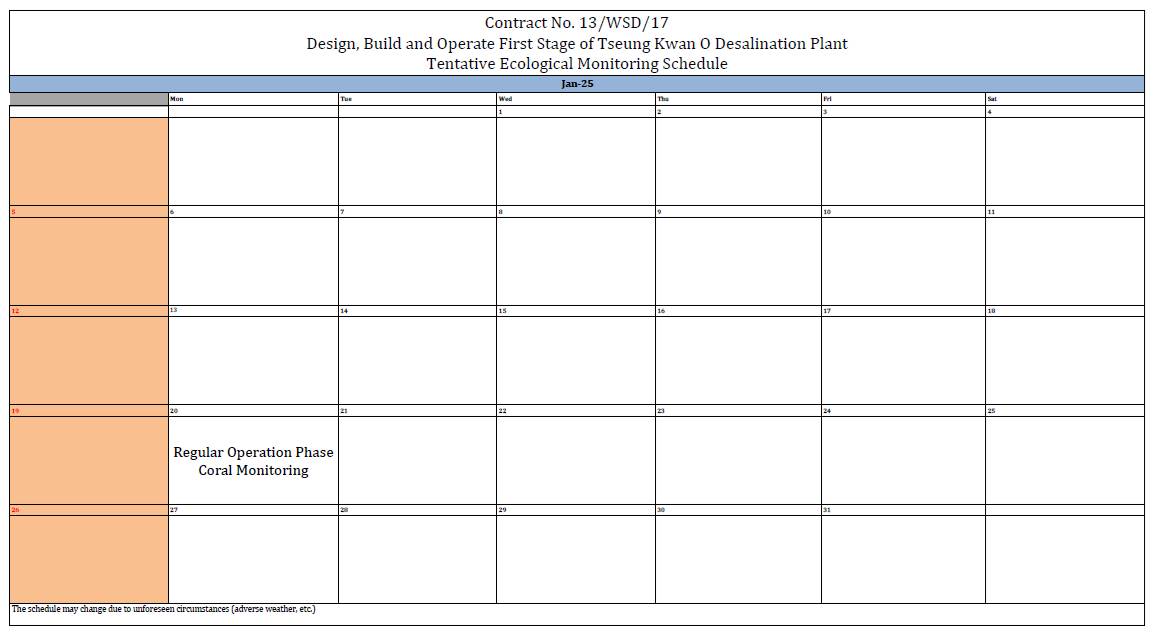 A2. In accordance with the Environmental Monitoring and Audit (EM&A) Manual for the Contract, EM&A works for marine water quality, waste management and ecology should be carried out by Environmental Team (ET), Aurecon Hong Kong Limited (Aurecon), during the Tseung Kwan O Desalination Plant.