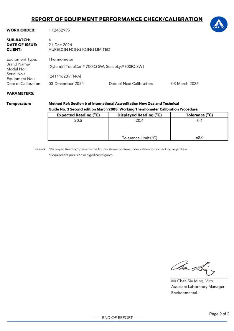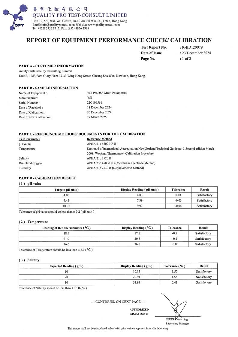 Water Quality Monitoring Equipment and Landfill Gas Equipment Calibration Certificate |