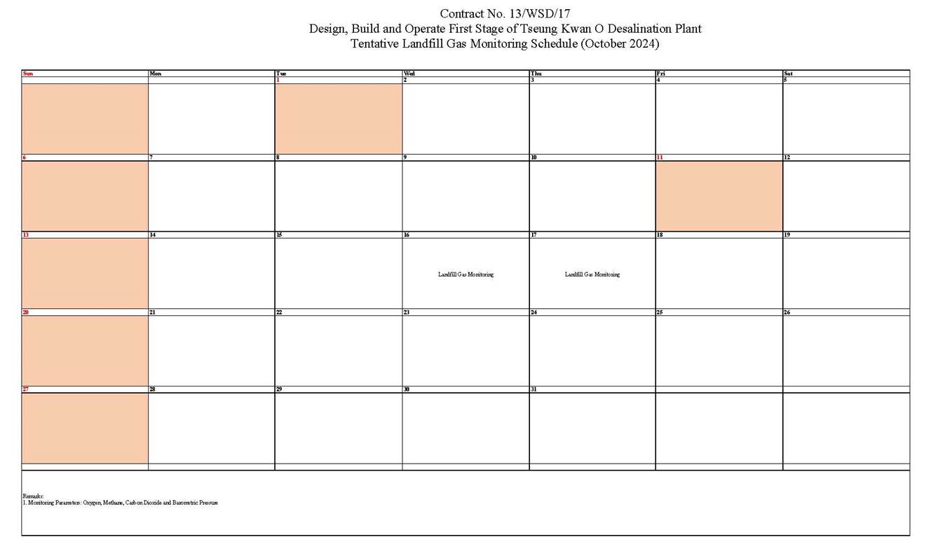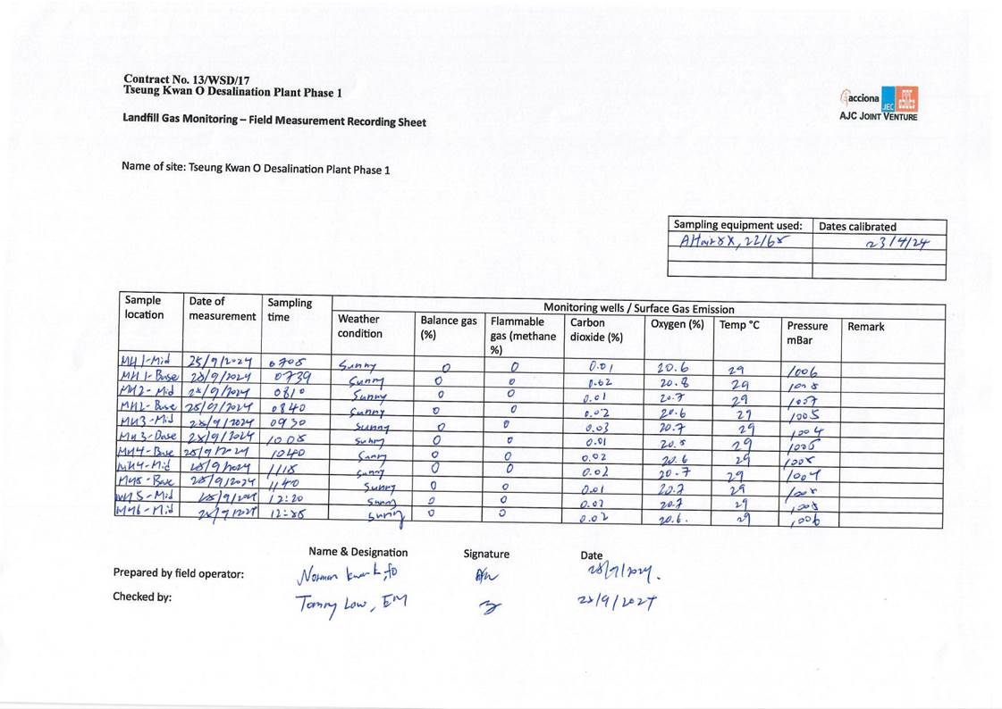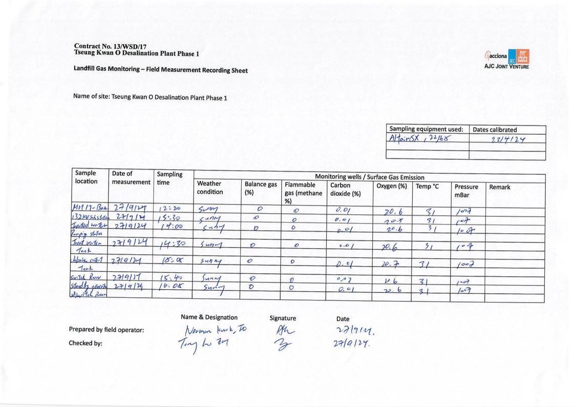 A9. In this reporting period, monthly landfill gas monitoring was conducted on 25, 26 and 27 September 2024. No exceedances of action level and limit level was observed.