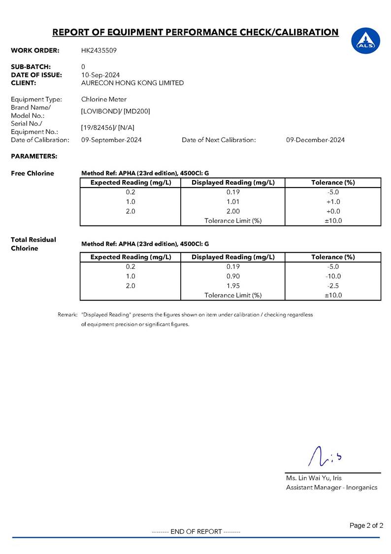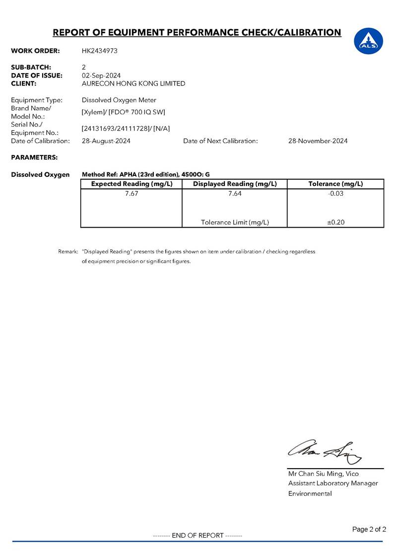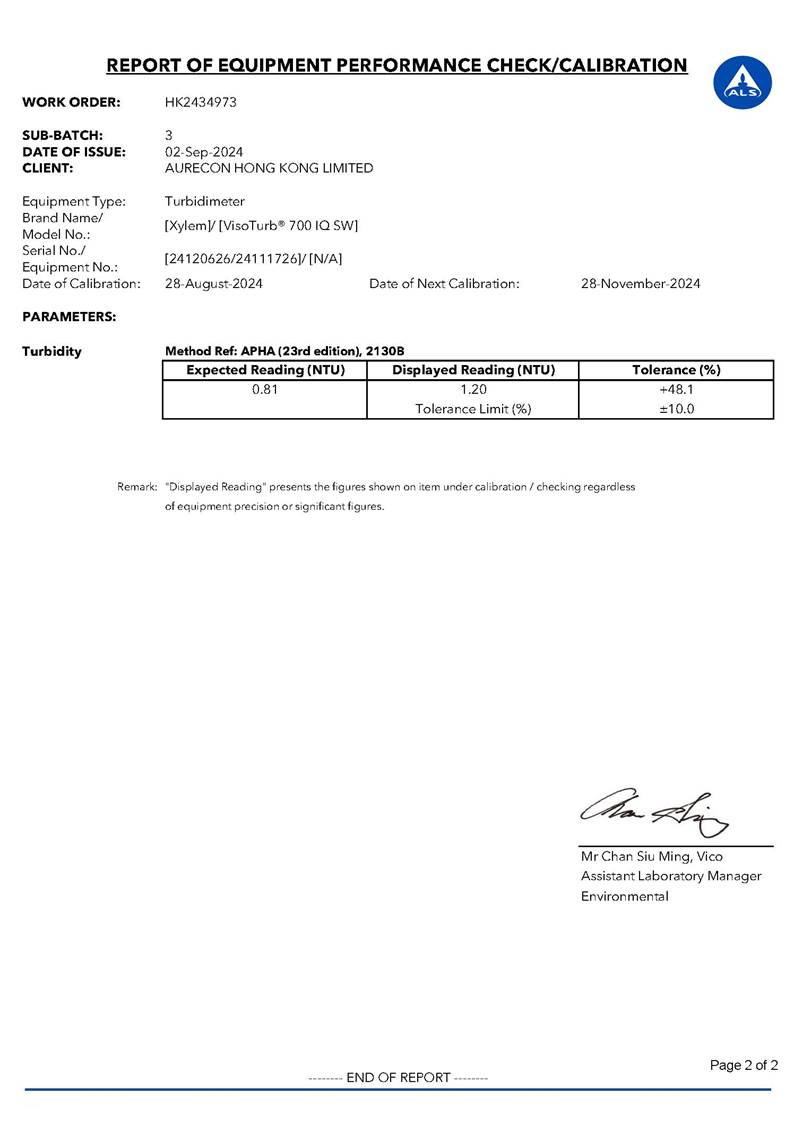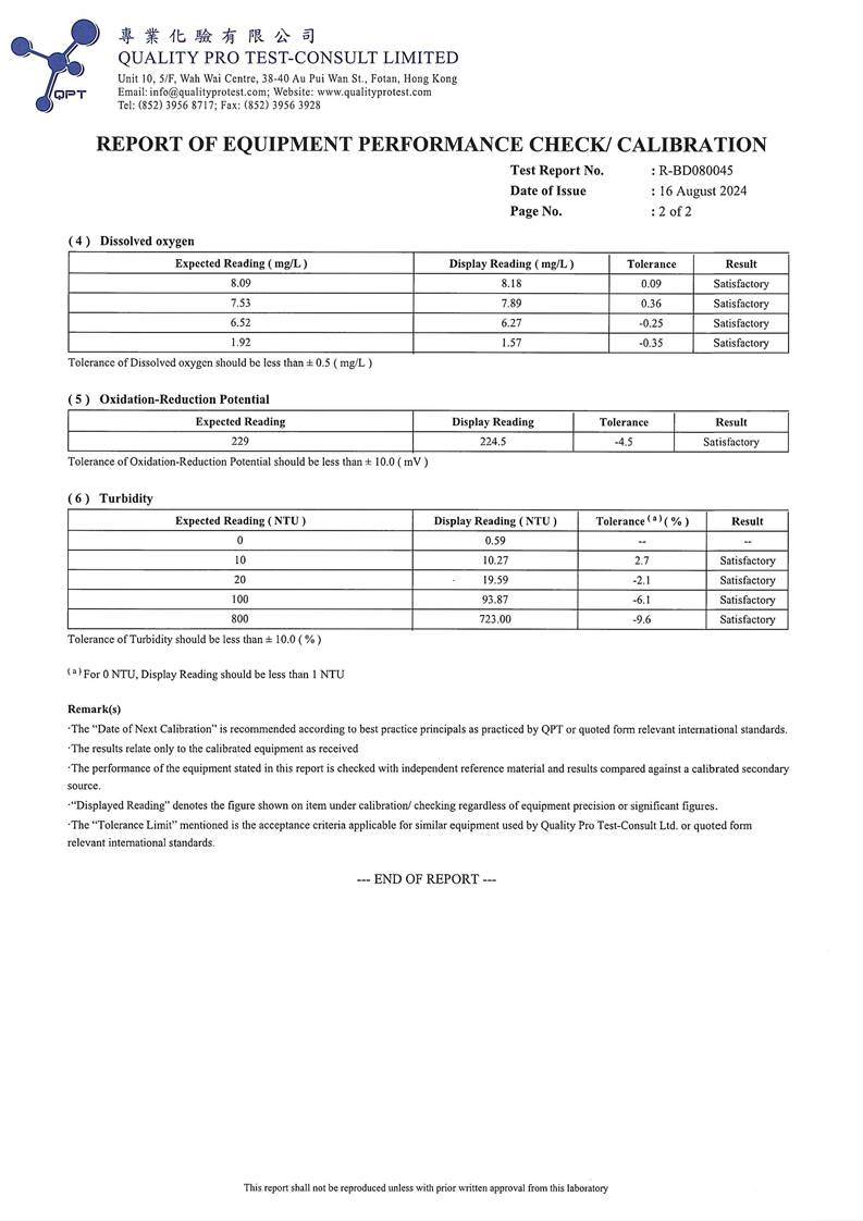 Water Quality Monitoring Equipment and Landfill Gas Equipment Calibration Certificate |