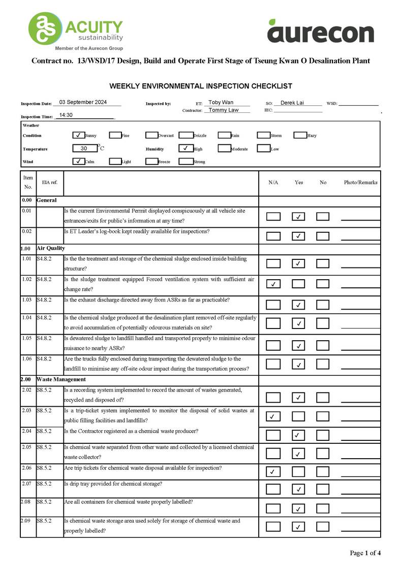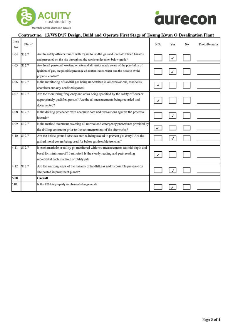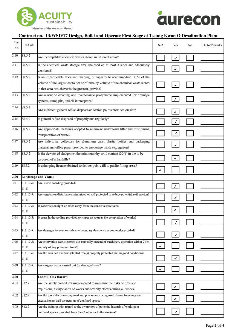 A2. In accordance with the Environmental Monitoring and Audit (EM&A) Manual for the Contract, EM&A works for marine water quality, waste management and ecology should be carried out by Environmental Team (ET), Aurecon Hong Kong Limited (Aurecon), during the Tseung Kwan O Desalination Plant.