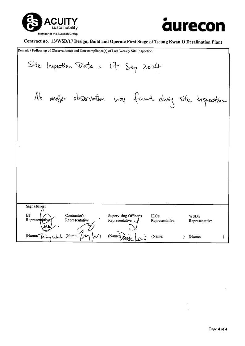 A10. In this reporting period, site inspections were carried out by ET on 3, 10, 17 and 24 September 2024. Joint site inspections of the operation work by ET were and IEC were carried out on 24 September 2024 to audit the mitigation measures implementation status.